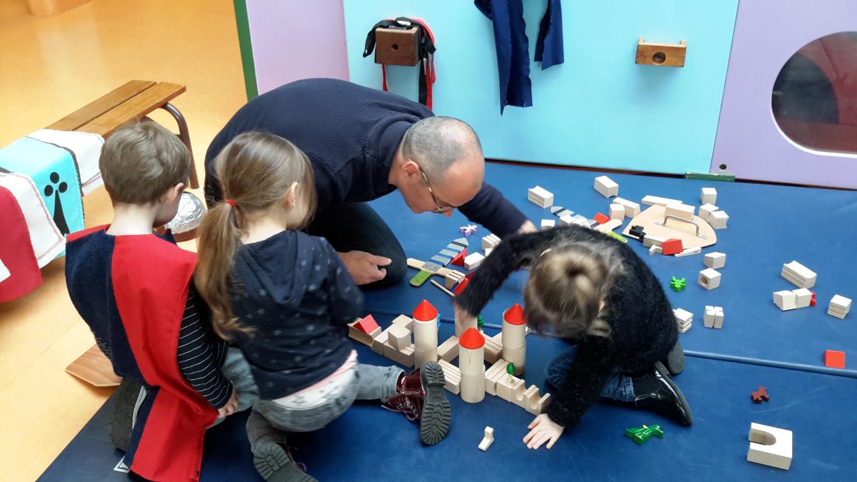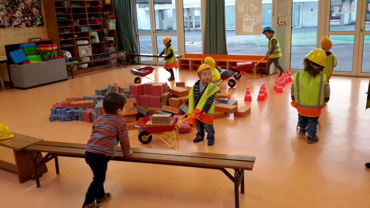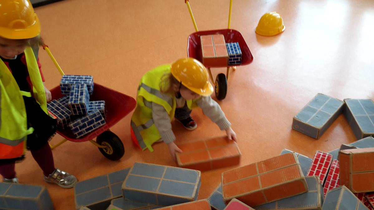 22 janvier: Quel Chantier! jeu de constructions avec briques, brouettes, casques, gilets jaunes.